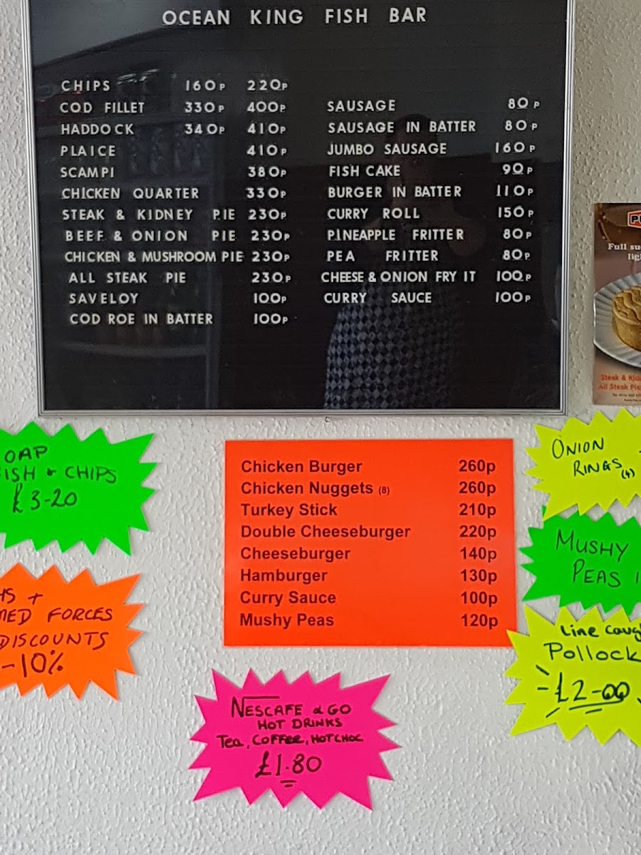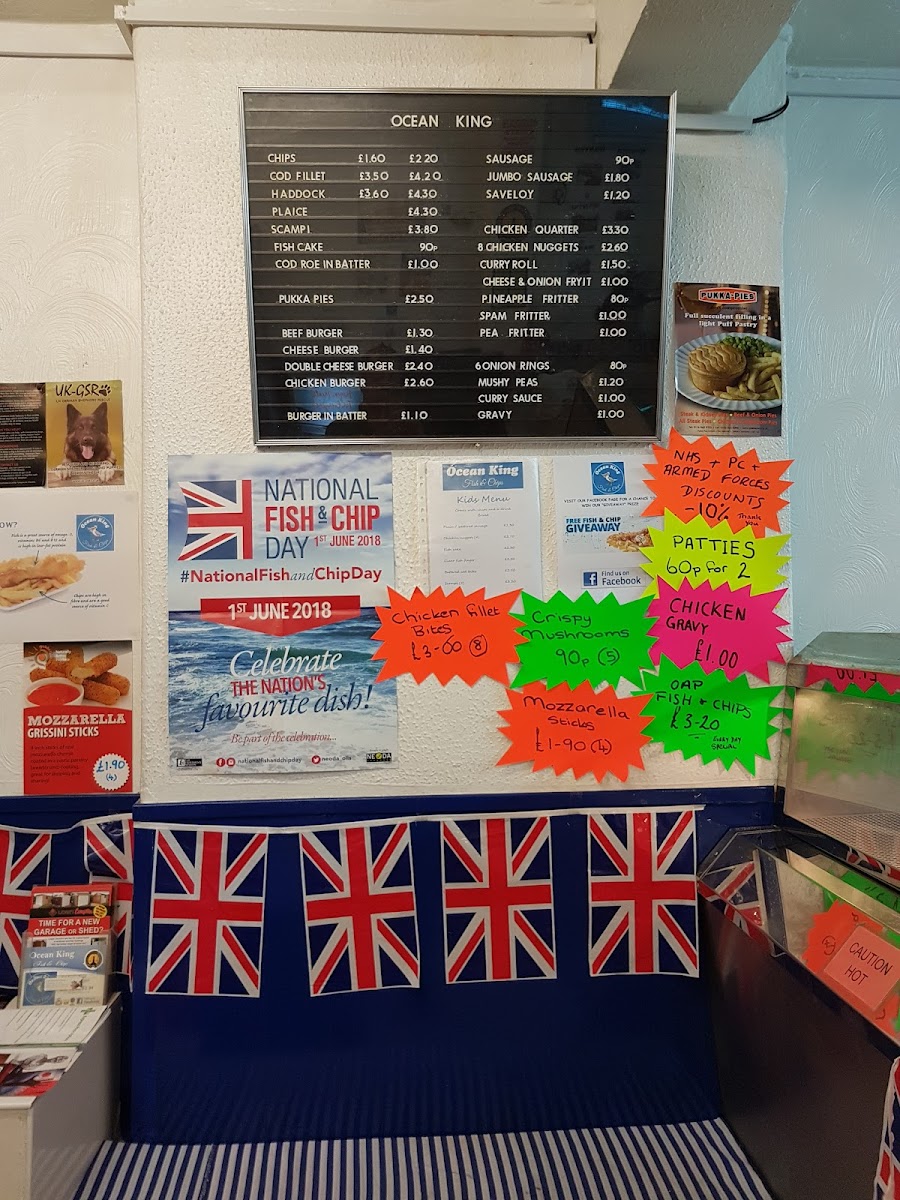 The menu at Ocean King Fish and Chips offers a diverse selection of options, catering to a wide range of tastes. For younger diners, the Kids Menu provides simple yet satisfying choices like Onion Rings, Mushy Peas, Curry Sauce, and Gravy. In addition, the main menu boasts a variety of hearty and flavorful dishes, including Scampi, Chicken Quarter, and a selection of classic pies such as Steak & Kidney Pie, Beef & Onion Pie, and Chicken & Mushroom Pie. Each dish delivers a comforting, traditional British meal, with something for everyone, whether you're in the mood for crispy fish and chips or a savory pie.